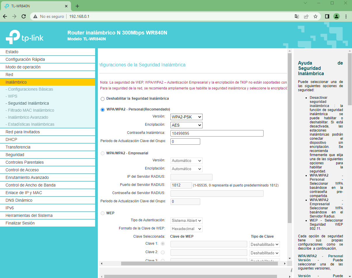 El siguiente paso es accesar al apartado de >Inalámbrico y seleccionar >Seguridad Inalámbrica como se muestra en la imagen.