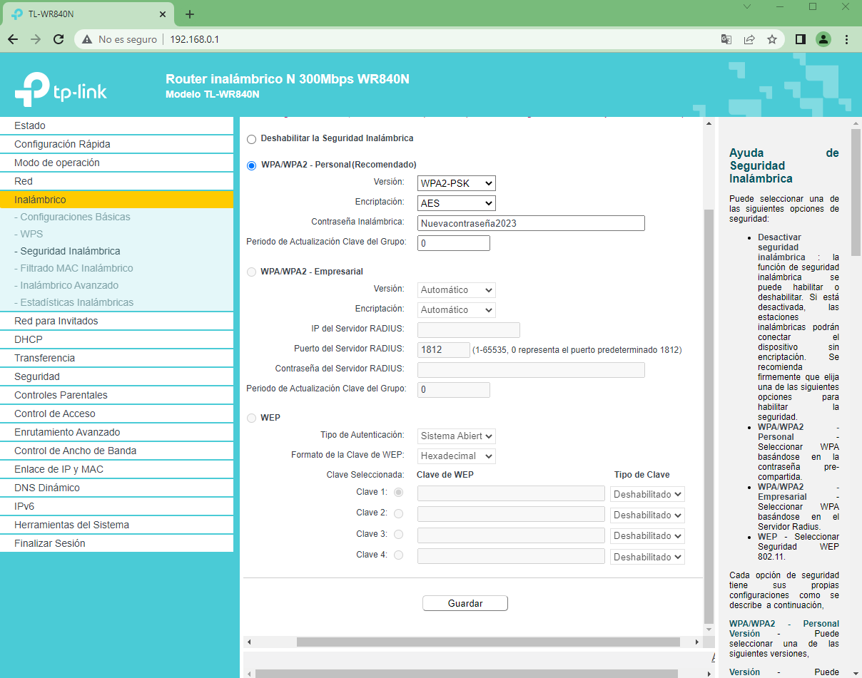 Borre y agregue su nueva contraseña en Contraseña inalámbrica, después de realizar el cambio click en guardar, recuerde que al realizar este cambio será desconectado de su red, deberá buscar en su dispositivo la red , dar en olvidar contraseña e ingresar la nueva contraseña que ha asignado.