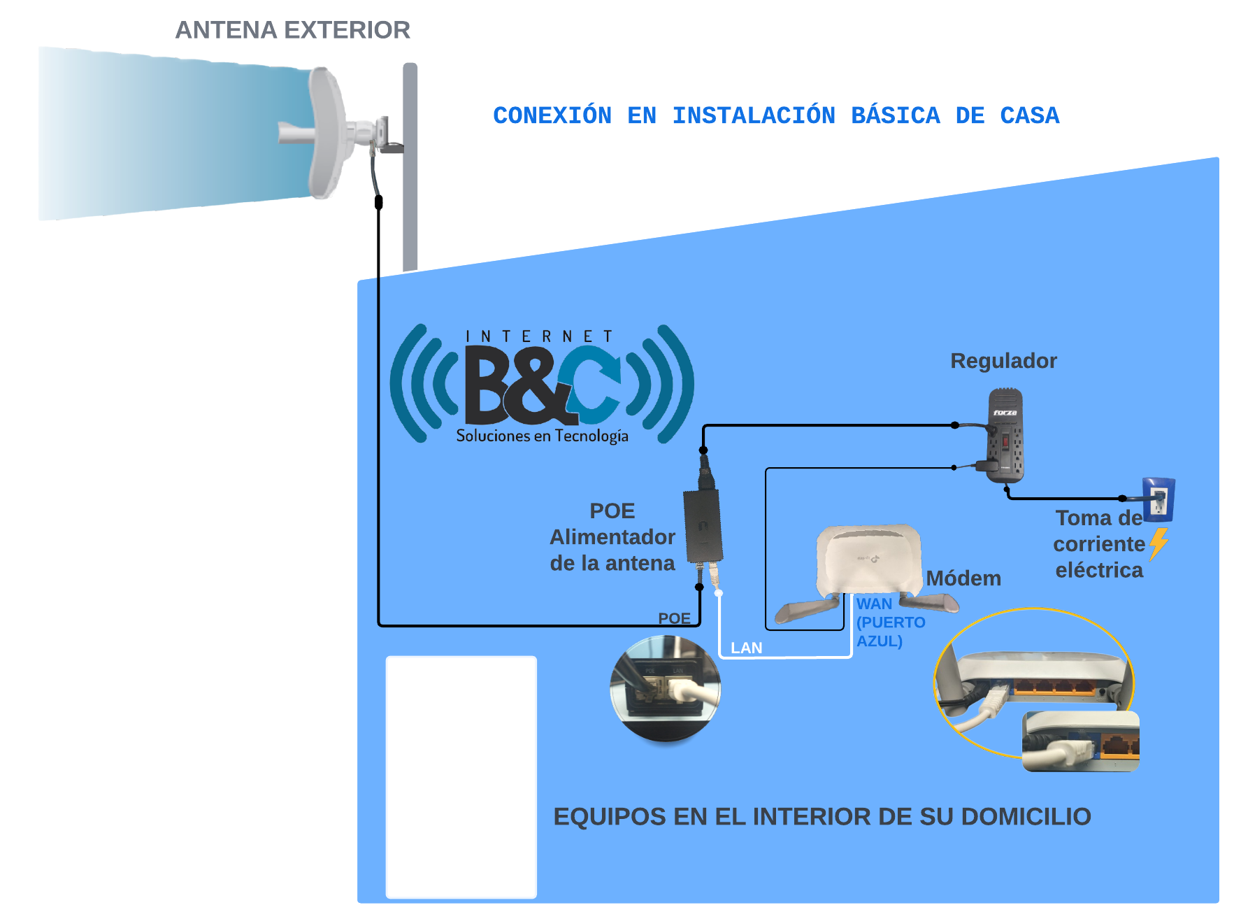 Una instalación básica consta de los siguientes equipos, una antena en el exterior y un módem dentro de su domicilio.